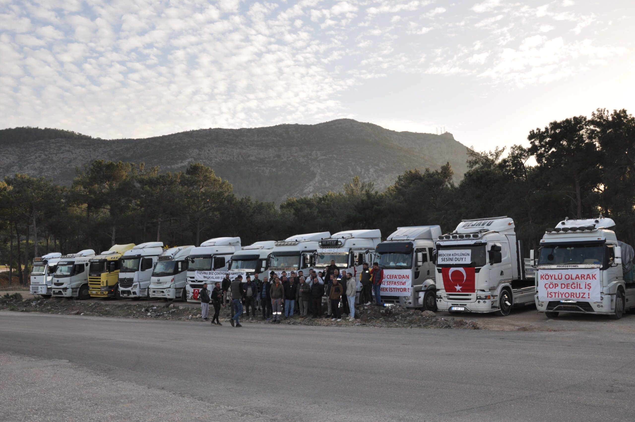 Silifke’ye bağlı Işıklı, Akdere ve Yeşilovacık bölgelerinde faaliyet gösteren SS 115 Akdere Işıklı Yeşilovacık Liman Damperli Taşımacılar Kooperatifi üyesi 52 kamyon şoförü, Akdere Mahallesi’ndeki kavşakta araçlarını park ederek protestoda bulundu. Bölgede yaşayan kamyon şoförleri, fabrikaların nakliye işlerinde yerel kooperatifler ve şahıslar yerine dışarıdan taşeron firmaları tercih ettiğini öne sürerek duruma tepki gösterdi. Araçlarını yol kenarına dizen şoförler, kamyonlarının üzerine “Köylü olarak çöp değil iş istiyoruz”, “Tozunu biz çekiyoruz sefasını başkaları sürüyor” ve “Taşeron istemiyoruz” yazılı pankartlar astı.