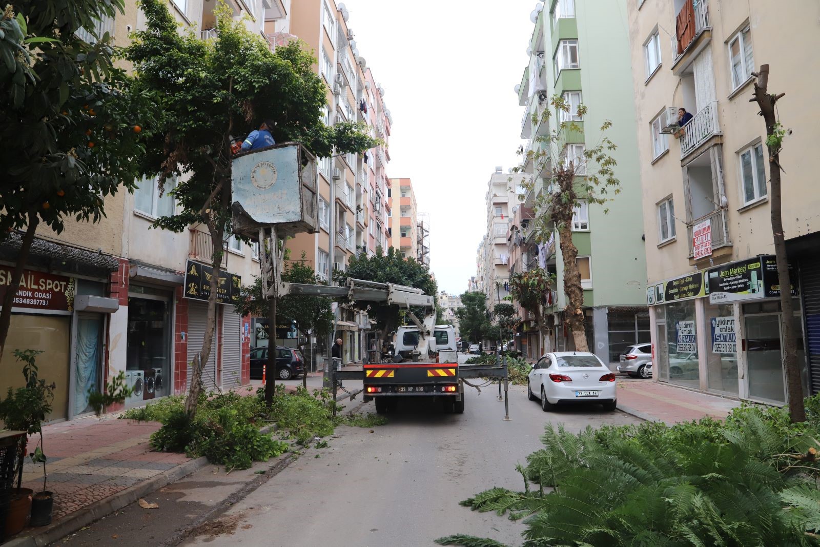 Hafta sonu yapılan çalışmalara motorize emniyet güçleri ile Akdeniz Zabıta Müdürlüğü ekipleri de destek verdi. Çalışma öncesinde sokak araç trafiğine kapatılarak gerekli güvenlik önlemleri alındı. Ardından Park ve Bahçeler Müdürlüğü ekipleri, sokak boyunca uzanan onlarca ağacı budadı. Kesilen dal ve yapraklar kepçe yardımıyla toplanarak kamyon ve traktörlere yüklendi ve mahalleden çıkarıldı.