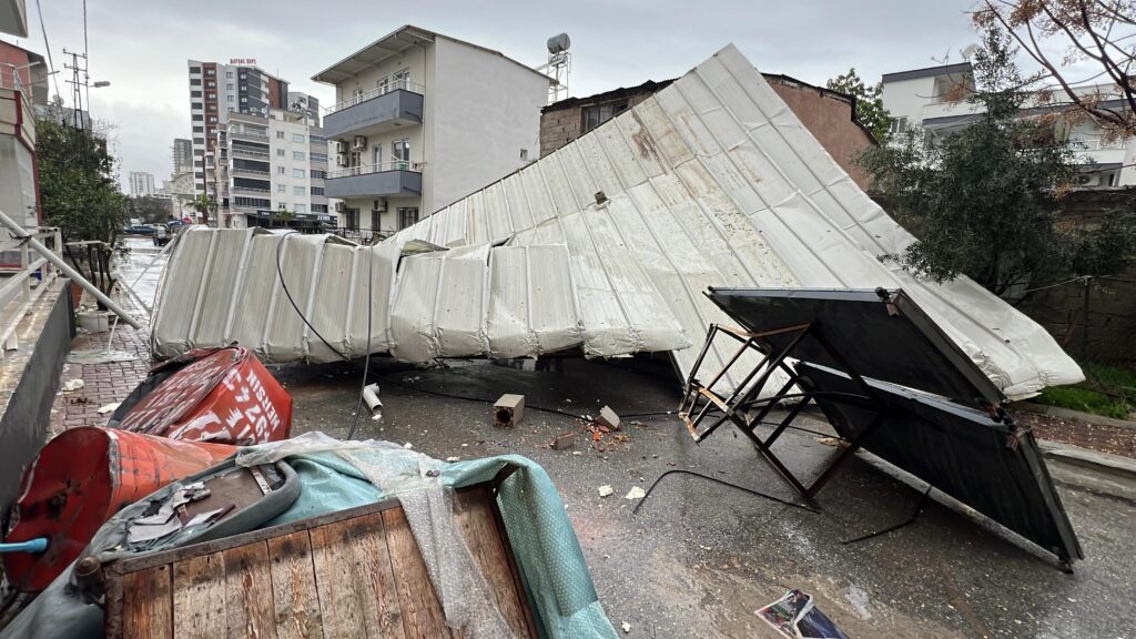 Meteoroloji Genel Müdürlüğü’nün yaptığı yağış ve fırtına uyarısının ardından Mersin’de sabah saatlerinden itibaren etkili olan kuvvetli rüzgar ve sağanak yağış, kent genelinde hayatı olumsuz etkiledi. Toroslar ilçesi Alsancak Mahallesi’nde yol üzerine bir ağaç devrildi. Devrilen ağaç nedeniyle ulaşım bir süre kontrollü sağlandı. Aynı ilçenin Demirtaş Mahallesi’nde ise 2 katlı bir binanın üst çatısına kurulu demir konstrüksiyon çatı, şiddetli rüzgarın etkisiyle yerinden koparak yola savruldu. Olayın ardından çevrede güvenlik önlemi alındı.